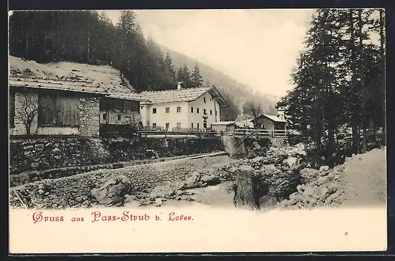 AK Pass-Strub, Ortsansicht mit kleiner Brücke