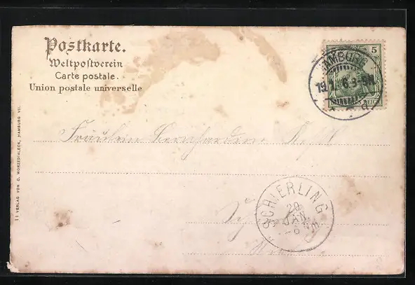 Personenbezogene Daten auf der Rückseite der Karte wurden durch blauen Textmarker unkenntlich gemacht. Die blauen Stellen sind auf die Vorderseite durchgeweicht und wirken sich negativ auf das Postkartenfoto aus
