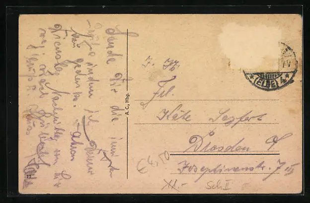 alte Ansichtskarte, gelaufen, Briefmarke entfernt, rückseitig Oberflächenschaden, guter Zustand