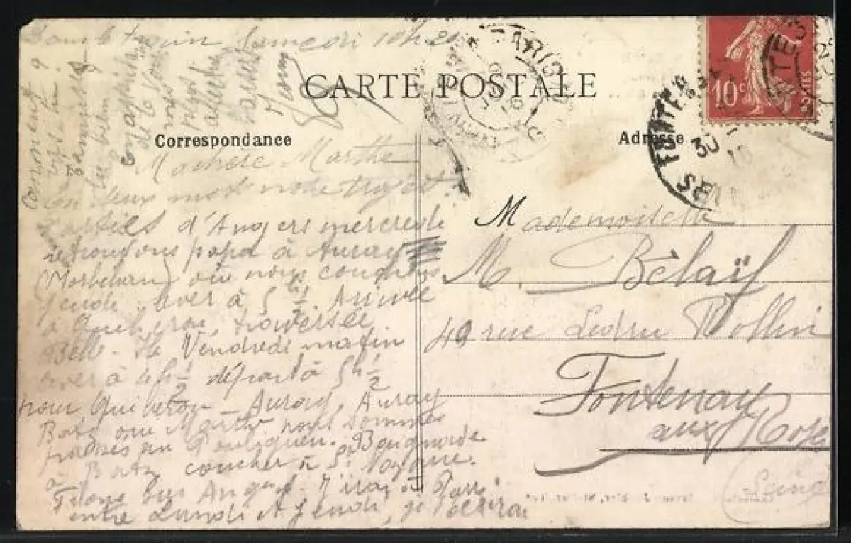 Personenbezogene Daten auf der Rückseite der Karte wurden durch blauen Textmarker unkenntlich gemacht. Die blauen Stellen sind auf die Vorderseite durchgeweicht und wirken sich negativ auf das Postkartenfoto aus