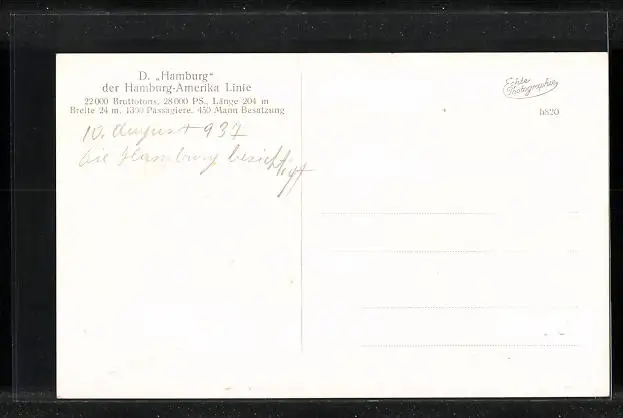 AK Passagierschiff Hamburg der H.-A.-Linie auf hoher See