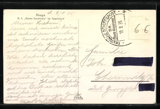 Personenbezogene Daten auf der Rückseite der Karte wurden durch blauen Textmarker unkenntlich gemacht. Die blauen Stellen sind auf die Vorderseite durchgeweicht und wirken sich negativ auf das Postkartenfoto aus