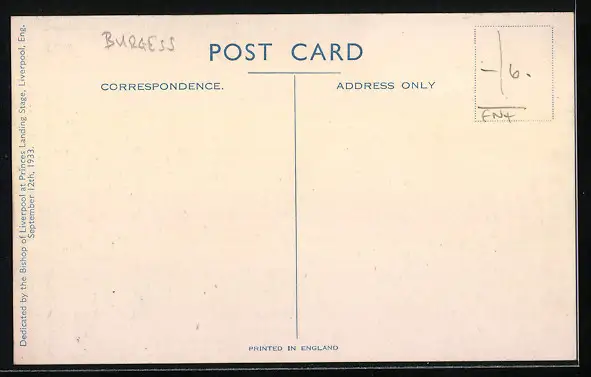 Personenbezogene Daten auf der Rückseite der Karte wurden durch blauen Textmarker unkenntlich gemacht. Die blauen Stellen sind auf die Vorderseite durchgeweicht und wirken sich negativ auf das Postkartenfoto aus