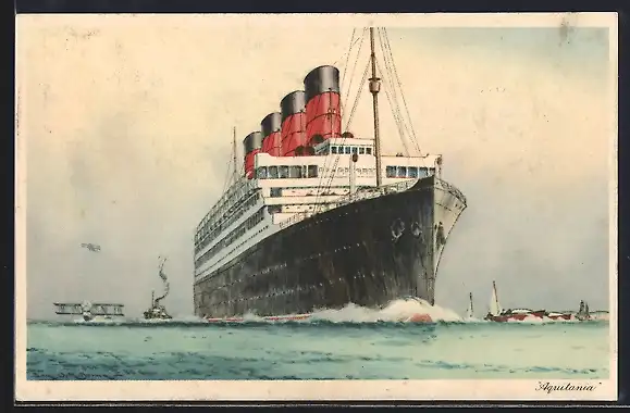 AK Passagierschiff Mauretania in Küstennähe in Bugansicht, Wasserflugzeug daneben