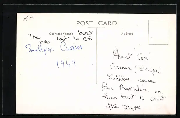 Personenbezogene Daten auf der Rückseite der Karte wurden durch blauen Textmarker unkenntlich gemacht. Die blauen Stellen sind auf die Vorderseite durchgeweicht und wirken sich negativ auf das Postkartenfoto aus