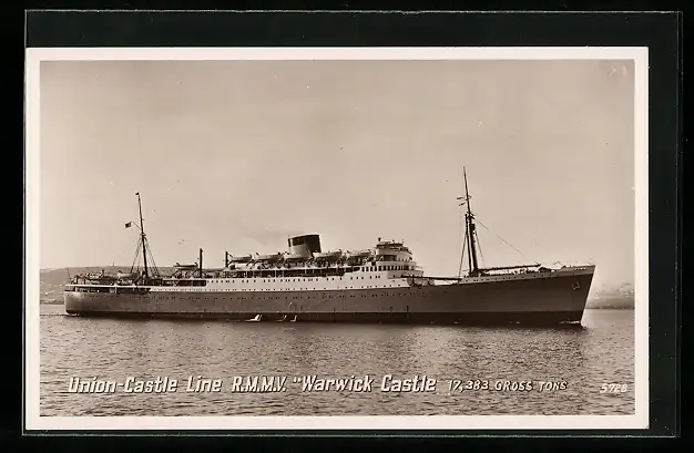 AK Passagierschiff RMMV Warwick Castle fährt in seichtem Gewässer, Union-Castle Line