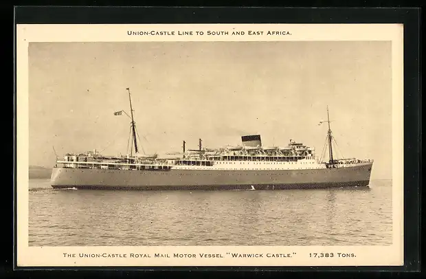 AK Passagierschiff RMMV Warwick Castle nahe der Küste, Union-Castle Line