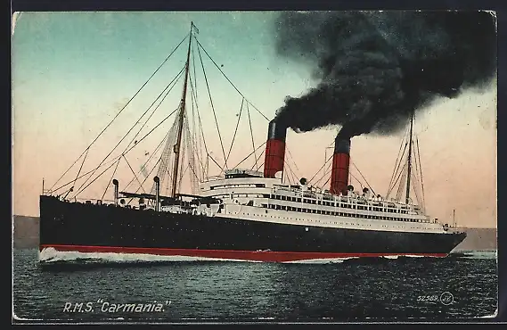 AK Passagierschiff RMS Carmania unter Volldampf vor der Küste