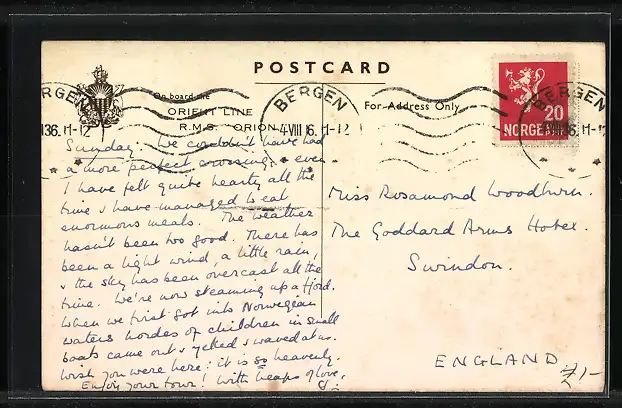 Personenbezogene Daten auf der Rückseite der Karte wurden durch blauen Textmarker unkenntlich gemacht. Die blauen Stellen sind auf die Vorderseite durchgeweicht und wirken sich negativ auf das Postkartenfoto aus