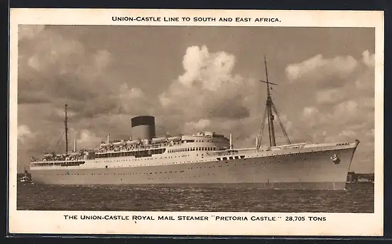 AK Passagierschiff RMS Pretoria Castle vor der Küste, Union-Castle Liner