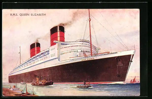 AK Passagierschiff RMS Queen Elizabeth vor der Küste