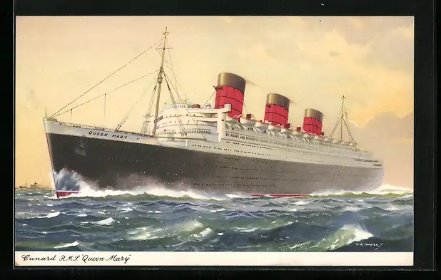 AK Passagierschiff R.M.S. Queen Mary in stürmischer See, Cunard Line