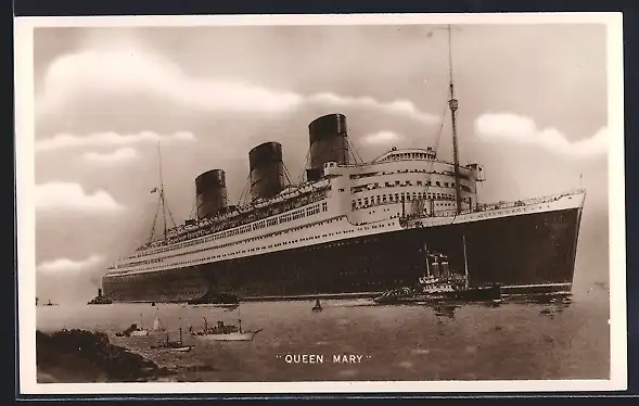 AK Passagierschiff RMS Queen Mary von der Küste aus