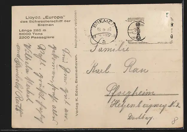 AK Passagierschiff S. S. Europa in Fahrt, Nordd. Lloyd