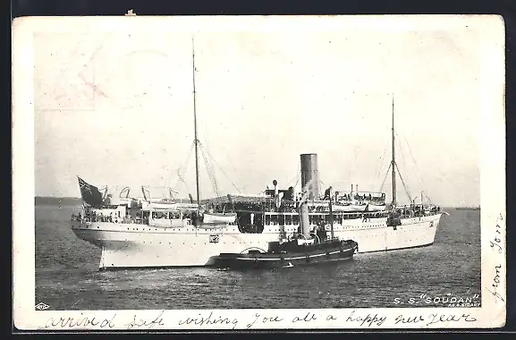 AK Passagierschiff SS Soudan auf dem Meer mit einem Schlepper