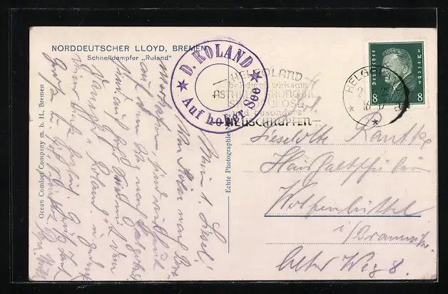 Personenbezogene Daten auf der Rückseite der Karte wurden durch blauen Textmarker unkenntlich gemacht. Die blauen Stellen sind auf die Vorderseite durchgeweicht und wirken sich negativ auf das Postkartenfoto aus