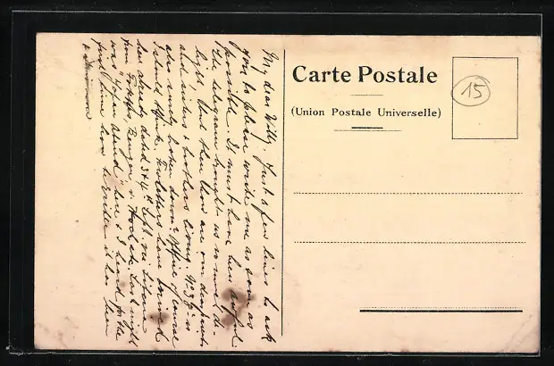 Personenbezogene Daten auf der Rückseite der Karte wurden durch blauen Textmarker unkenntlich gemacht. Die blauen Stellen sind auf die Vorderseite durchgeweicht und wirken sich negativ auf das Postkartenfoto aus