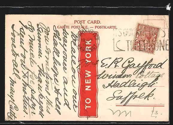 Personenbezogene Daten auf der Rückseite der Karte wurden durch blauen Textmarker unkenntlich gemacht. Die blauen Stellen sind auf die Vorderseite durchgeweicht und wirken sich negativ auf das Postkartenfoto aus