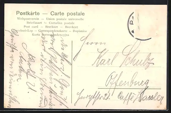 alte Ansichtskarte, gelaufen, Briefmarke entfernt, Eckknick unten re., Stempelspur, guter Zustand