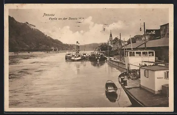 AK Passau, Donaupartie mit Dampfer