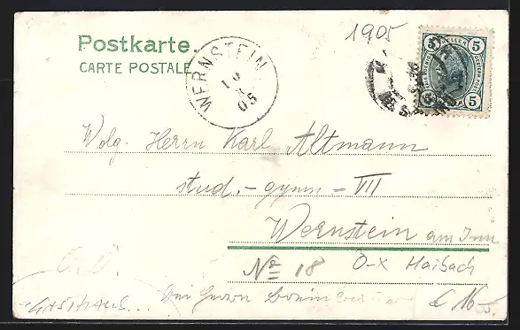 alte Ansichtskarte, gelaufen 1905, Eckknick li. oben, Bugspur unten mittig, guter Zustand