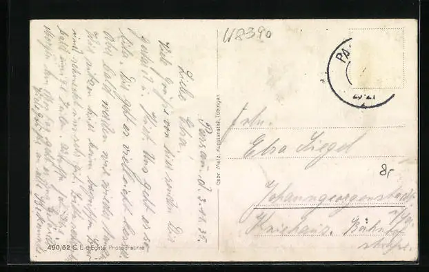 Personenbezogene Daten auf der Rückseite der Karte wurden durch blauen Textmarker unkenntlich gemacht. Die blauen Stellen sind auf die Vorderseite durchgeweicht und wirken sich negativ auf das Postkartenfoto aus