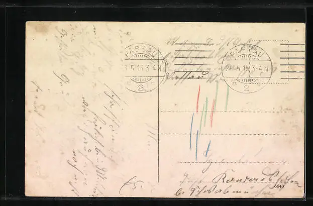 Personenbezogene Daten auf der Rückseite der Karte wurden durch blauen Textmarker unkenntlich gemacht. Die blauen Stellen sind auf die Vorderseite durchgeweicht und wirken sich negativ auf das Postkartenfoto aus