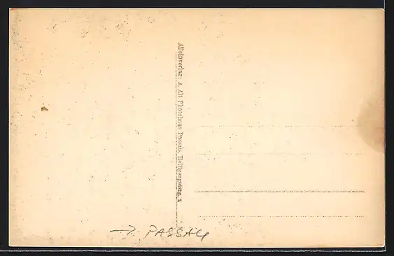 Personenbezogene Daten auf der Rückseite der Karte wurden durch blauen Textmarker unkenntlich gemacht. Die blauen Stellen sind auf die Vorderseite durchgeweicht und wirken sich negativ auf das Postkartenfoto aus