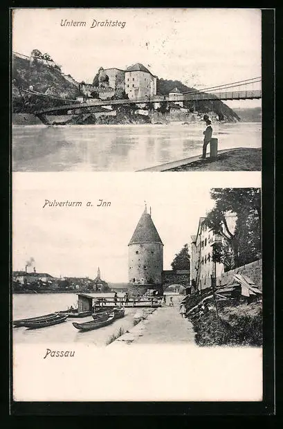 AK Passau, Unterm Drahtsteg, Pulverturm am Inn