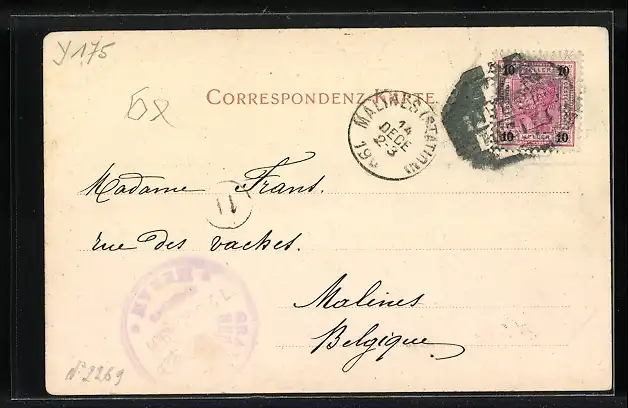 Personenbezogene Daten auf der Rückseite der Karte wurden durch blauen Textmarker unkenntlich gemacht. Die blauen Stellen sind auf die Vorderseite durchgeweicht und wirken sich negativ auf das Postkartenfoto aus