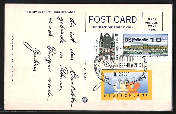 Personenbezogene Daten auf der Rückseite der Karte wurden durch blauen Textmarker unkenntlich gemacht. Die blauen Stellen sind auf die Vorderseite durchgeweicht und wirken sich negativ auf das Postkartenfoto aus