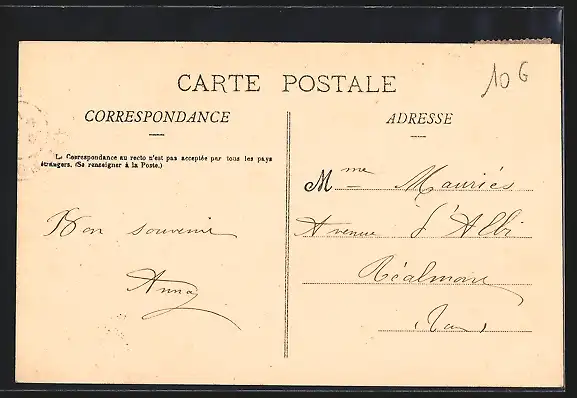 Personenbezogene Daten auf der Rückseite der Karte wurden durch blauen Textmarker unkenntlich gemacht. Die blauen Stellen sind auf die Vorderseite durchgeweicht und wirken sich negativ auf das Postkartenfoto aus