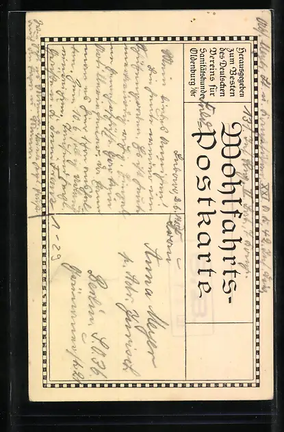Personenbezogene Daten auf der Rückseite der Karte wurden durch blauen Textmarker unkenntlich gemacht. Die blauen Stellen sind auf die Vorderseite durchgeweicht und wirken sich negativ auf das Postkartenfoto aus