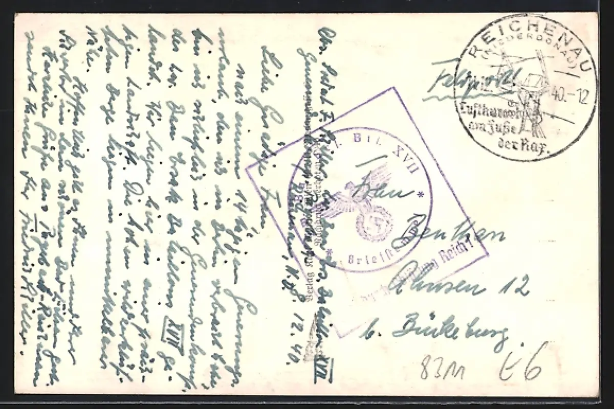 Personenbezogene Daten auf der Rückseite der Karte wurden durch blauen Textmarker unkenntlich gemacht. Die blauen Stellen sind auf die Vorderseite durchgeweicht und wirken sich negativ auf das Postkartenfoto aus