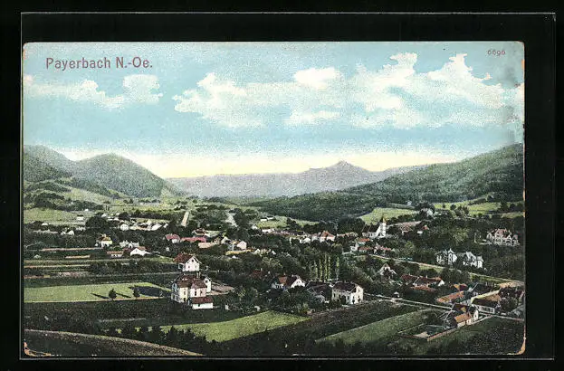 AK Payerbach, Ortsansicht mit Umgebung und Bergblick