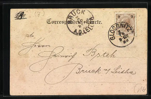 Personenbezogene Daten auf der Rückseite der Karte wurden durch blauen Textmarker unkenntlich gemacht. Die blauen Stellen sind auf die Vorderseite durchgeweicht und wirken sich negativ auf das Postkartenfoto aus