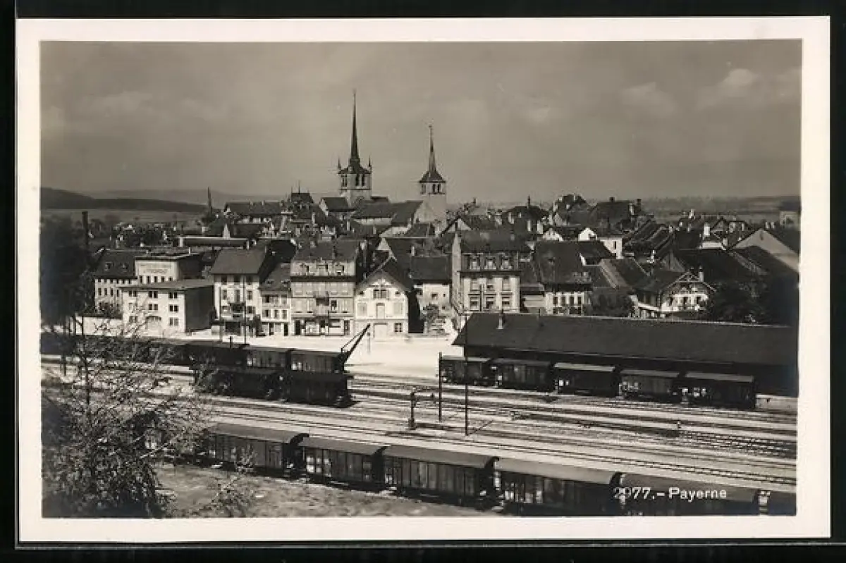 AK Payerne, Blick über den Bahnhof zur Kirche