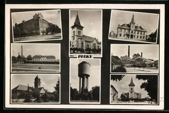 AK Pecky, Gebäudeansicht, Kirche, Bahnhof
