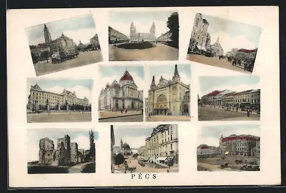 AK Pécs, Blick auf Ruine, Strassenbahn vor Geschäften
