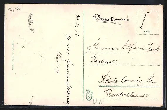 Personenbezogene Daten auf der Rückseite der Karte wurden durch blauen Textmarker unkenntlich gemacht. Die blauen Stellen sind auf die Vorderseite durchgeweicht und wirken sich negativ auf das Postkartenfoto aus