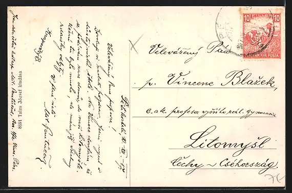 Personenbezogene Daten auf der Rückseite der Karte wurden durch blauen Textmarker unkenntlich gemacht. Die blauen Stellen sind auf die Vorderseite durchgeweicht und wirken sich negativ auf das Postkartenfoto aus