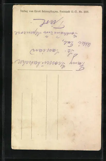 Personenbezogene Daten auf der Rückseite der Karte wurden durch blauen Textmarker unkenntlich gemacht. Die blauen Stellen sind auf die Vorderseite durchgeweicht und wirken sich negativ auf das Postkartenfoto aus