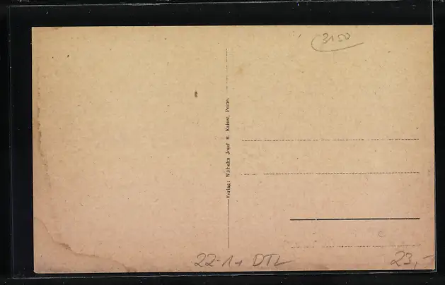 Personenbezogene Daten auf der Rückseite der Karte wurden durch blauen Textmarker unkenntlich gemacht. Die blauen Stellen sind auf die Vorderseite durchgeweicht und wirken sich negativ auf das Postkartenfoto aus