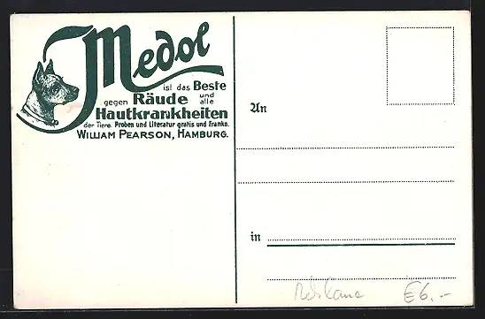 Personenbezogene Daten auf der Rückseite der Karte wurden durch blauen Textmarker unkenntlich gemacht. Die blauen Stellen sind auf die Vorderseite durchgeweicht und wirken sich negativ auf das Postkartenfoto aus