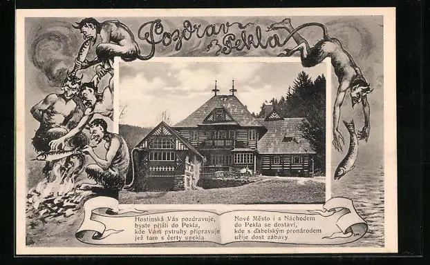 AK Peklo, Gasthaus, Teufel beim Fischfang