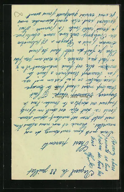 Personenbezogene Daten auf der Rückseite der Karte wurden durch blauen Textmarker unkenntlich gemacht. Die blauen Stellen sind auf die Vorderseite durchgeweicht und wirken sich negativ auf das Postkartenfoto aus