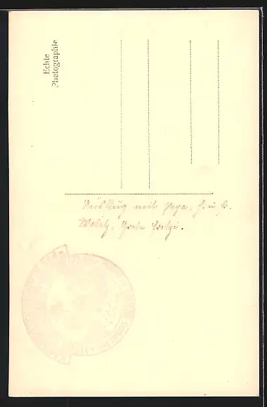 Personenbezogene Daten auf der Rückseite der Karte wurden durch blauen Textmarker unkenntlich gemacht. Die blauen Stellen sind auf die Vorderseite durchgeweicht und wirken sich negativ auf das Postkartenfoto aus
