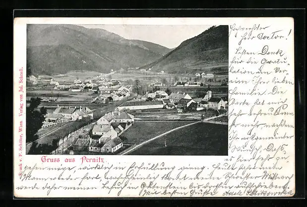 AK Pernitz, Gesamtansicht aus der Vogelschau, mit Bergblick