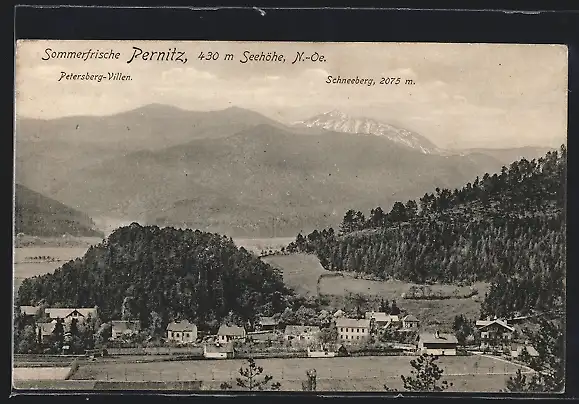 AK Pernitz, Ortsansicht mit Petersberg-Villen und Schneeberg