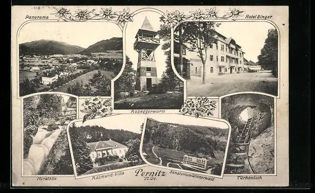 AK Pernitz, Sanatorium Wienerwald, Raimund-Villa, Roseggerwarte